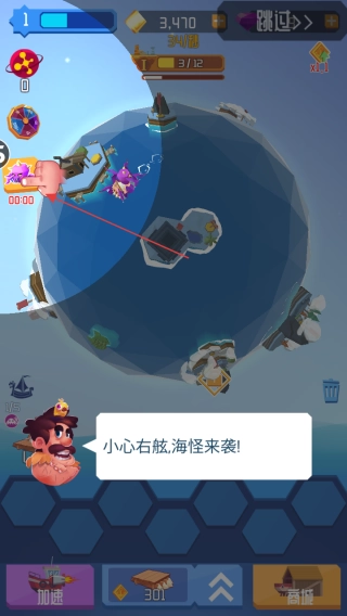 1. 进入游戏后,查看左上角等级1以及资源数量3470 。同时,要留意提示,小心右舷,因为海怪即将来袭!还要了解海怪出现的方位。