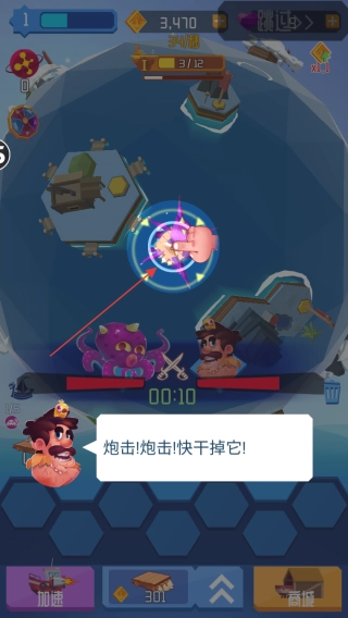 2、海怪现身之后,点击屏幕上的海怪发起攻击,按照提示“炮击!炮击!快干掉它!”,集中火力将海怪消灭。