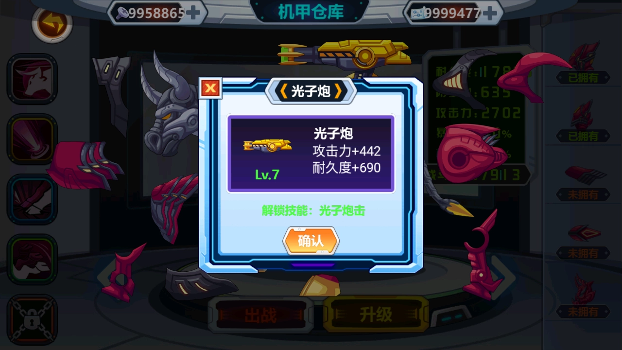 2、零件与图纸是游戏中的货币,可用来购买解锁猛兽以及购置升级机甲装备。虽说升级消耗速度较快,但不必担忧,游戏内设有9999999的零件和图纸,而且不用观看广告就能获取奖励。