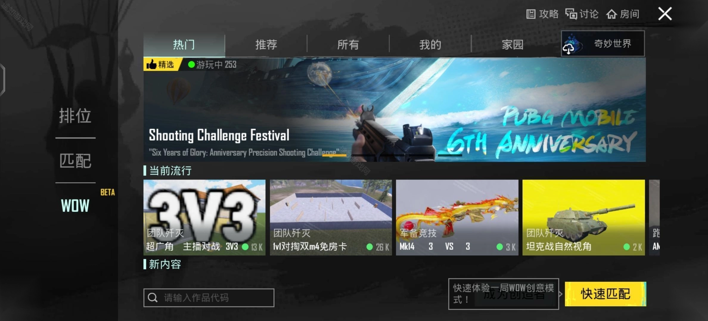 在PUBG里,除了可以体验热门的地铁逃生模式,还能选择游玩WOW创意模式,简单来说,它就是自定义模式。WOW模式中有大量玩家自行设计的地图场景与全新玩法。当你在排位模式玩累了,不妨到WOW模式中放松放松,感受别样的射击体验!