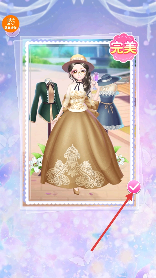4、完成搭配后,点击展示页的对勾,以获取“完美”评价,随后保存造型。