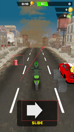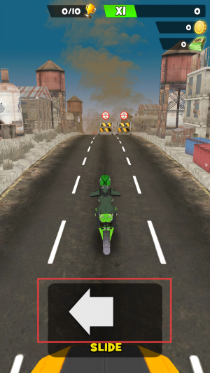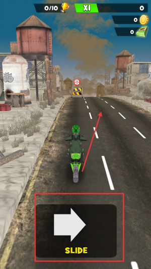 2. 遇到障碍时,点击右侧的【SLIDE】,向右滑动摩托,巧妙躲避路障。