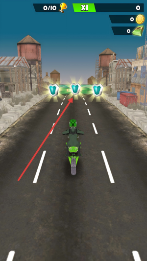 3、在行驶过程中,将目标对准蓝色道具,适时调整摩托车行驶路线,以收集能够增强能力的道具。