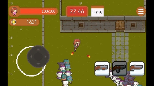 2. 游戏初始会与一群怪物展开战斗,画面左上角显示玩家血量,右下角为武器选择区域。玩家无需手动操作开枪,武器会自动射击。