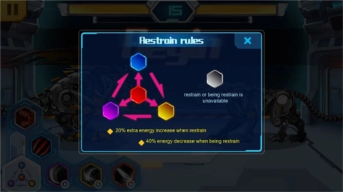 2、在机甲兽的正下方是技能系统,不同技能分别标以不同颜色,这是因为技能之间会相互作用,存在克制关系,利用好技能属性相互克制,轻松战胜对手,即便战力不及对方也能轻松取胜。