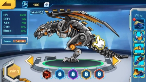 1、首先根据引导,完成前期的新手教学。如图所示,在这里最右侧是已获得的机甲装备,通过拖动可以穿戴;左上角在返回键的下方有关于机甲兽的详细属性,从上往下依次是生命值(耐久度)、防御力、攻击力、暴击率和格挡率。