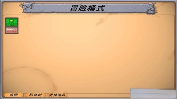 3. 点击冒险模式后需要选择关卡,下方可以选择科技树和更换携带的道具。