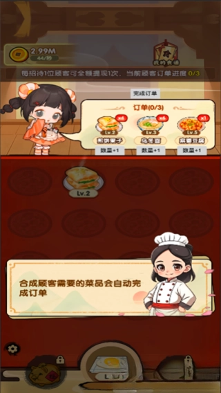 1.采用模拟经营的玩法,每日营业获取金币后可以提升餐厅的设施与规模的等级。