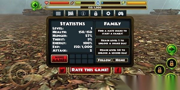 1、在游戏中,为蟒蛇设置了生命、食物、水、体力等多种属性参数,这些参数会对蟒蛇的状态产生影响。