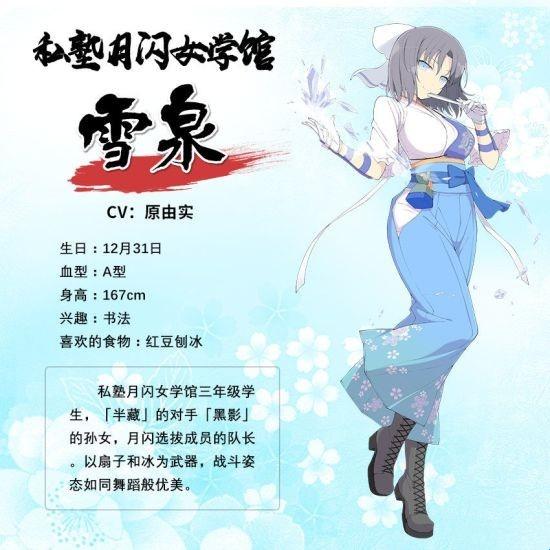 简介:雪泉是私塾月闪女学馆的三年级生,也是半藏的对手及黑影的孙女。她是月闪选拔队伍的队长,擅长运用扇子与玄冰作为武器,战斗姿态如同舞蹈般优雅。
