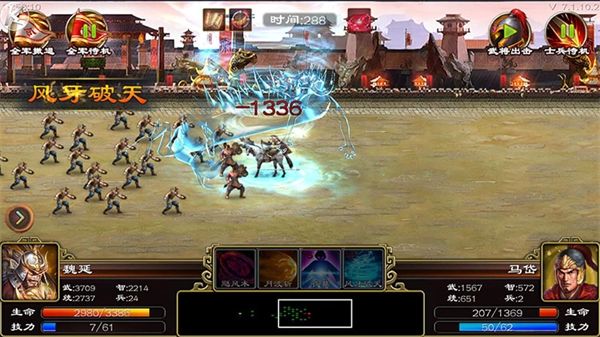 技能分为军师技与武将技。军师技,是指当玩家选择某位名将作为军师时,该名将会自动对我方与敌方军队的整体属性产生作用。武将技则是名将在与敌人战斗时所使用的必杀技能,武将技在很大程度上能够决定战局的胜负。由于释放技能会消耗技力,且还需要短暂的冷却时间,因此玩家需要制定一些技能释放策略。