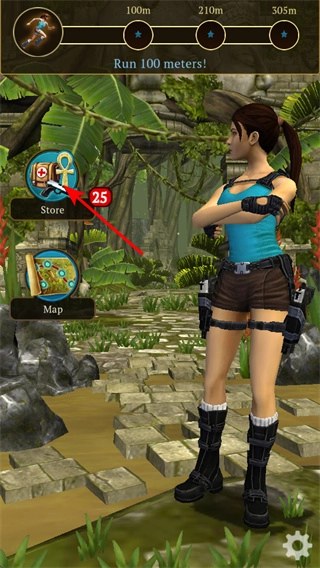 2、紧接着是道具作用引导,进入商店后,红色箭头会指向Head Start道具,并说明该道具能使劳拉在奔跑过程中快速前进一段距离。