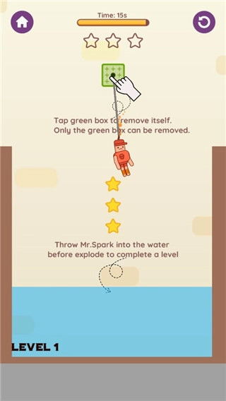 4、倒计时规则:在点击蓝色盒子后,需在星火先生落入水中的时间耗尽之前完成相关操作。