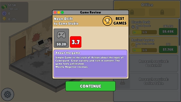 《放置游戏开发模拟器》(Idle Game Dev Simulator)是一款模拟经营类游戏。在游戏里,玩家要白手起家,打造属于自己的游戏帝国。一切从简陋的车库起步,仅有一桌一椅,一人对着一台电脑,全靠自己的努力,为人生增添精彩,开发出属于自己的游戏,以此获取利润。接着用赚来的钱升级办公室,招募优秀员工,逐步发展成为真正的游戏巨头。 在《放置游戏开发模拟器》手机版中,玩家需要挑选合适的游戏类型、热门的主题,凭借高超的技术水平,开发出爆款游戏。与此同时,要合理规划资金,保证收益能够覆盖开发成本,还能支撑后续项目,亲身感受从无到有成为巨头的成长过程。