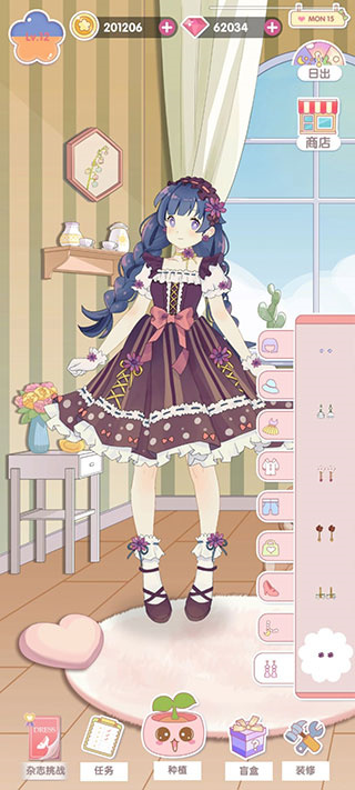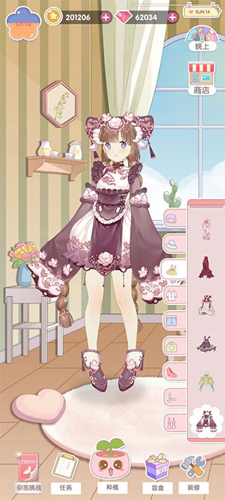 1、玩法方面就是种花,得装扮,之后闯关,家具建造算是单独板块吧,暂时没有看到与主线有联系。C,B级衣服都只有一件连衣裙,没有上下身分开,(A,S还没熟),所以就是一套7件,头发,帽子,项链,衣服,鞋,手饰。