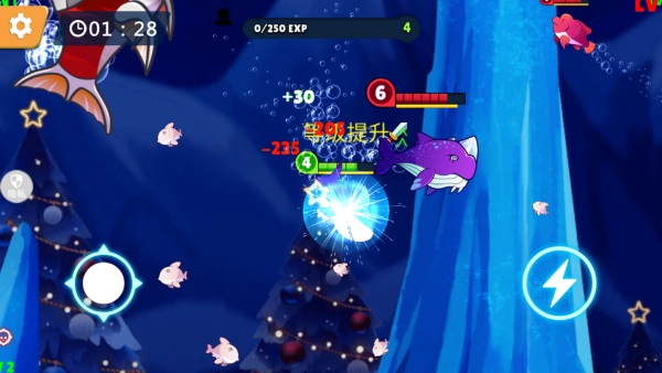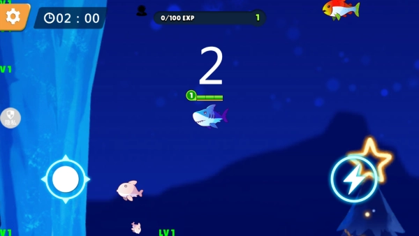 2. 通过操控左侧摇杆,助力鲨鱼游动,让它吞噬其他小鱼,以此提升自身等级与体型。