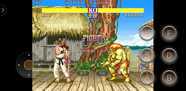 1、开启街头霸王2汉化版的手机版本,首先轻点“投币”选项,接着点击“开始”按钮。