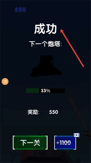 4、当成功击败所有目标,关卡即宣告通关。此时,玩家不仅能够获取奖励,还能解锁下一个炮塔。若想继续挑战新关卡,点击“下一关”即可。