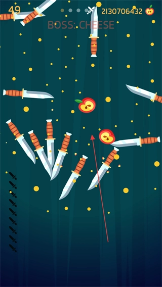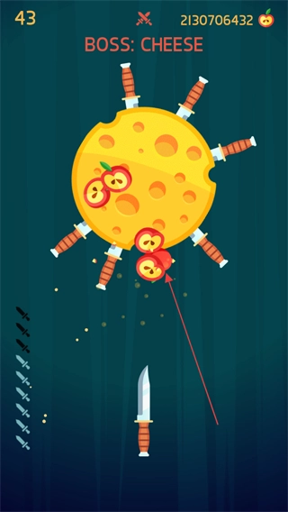 1. 踏入关卡,见到 BOSS:CHEESE,对准奶酪 BOSS 投掷飞刀,与此同时,躲开苹果以及已经插着的飞刀。