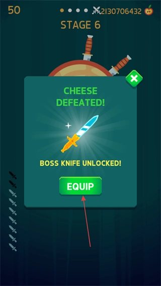 3、成功击败BOSS:CHEESE后,系统会弹出提示,此时点击EQUIP按钮,即可解锁并装备新飞刀。