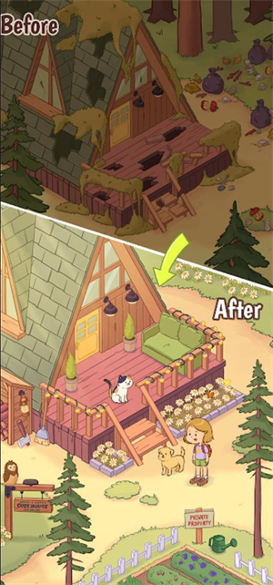 游戏核心是轻松有趣的合成循环。拖动两个相同等级的物品即可合成一个更高级的新物品。从合成食材、工具,到家具和完整的建筑,层层递进。您需要合理规划庭院布局,放置生产建筑,完成居民们的订单请求,推进主线剧情,并解锁更多森林区域和隐藏故事。