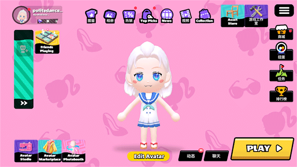 4.进入游戏主界面,在这可以进入商城、观看排行榜,查看相关任务等等,点击play进入游戏项目界面