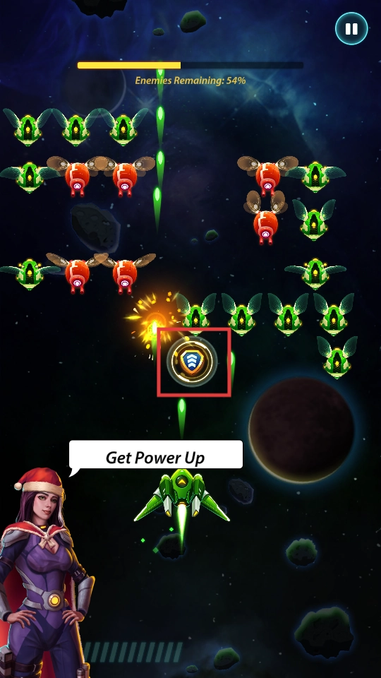 3、战斗中靠近并获取【能量道具】,提升【战机】战斗力,更快消灭剩余【敌机】。