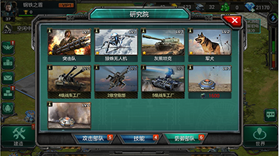研究院分为三大部分:攻击部队、防御部队与技能研究。研究内容涵盖这三大领域属性升级。技能解锁受研究院等级、空指挥等级、战车工厂等级及武装指挥部等级制约,部分项目还能通过图纸进阶研究。研究主要消耗石油资源,也可用钻石加速进程。
