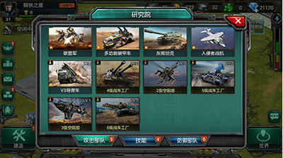 攻击部队研究涉及:联盟军、多功能装甲车、灰熊坦克、入侵者战机、V3导弹车、重型坦克、长弓直升机、光棱坦克、基洛夫空艇、猛犸坦克;