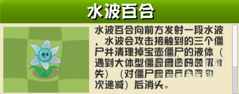 1. 水波百合:会向前方发射水波,此水波具备同时攻击多个僵尸的能力,还能清除炸弹效果。其大招更是能对一整行的敌人造成伤害。