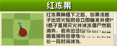 4. 红冻果:具备冻结周边僵尸的能力,触发区域内可实现灭火效果,其大招更是能够将火焰转化为阳光。