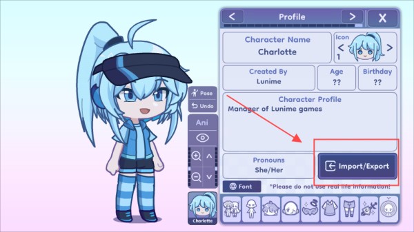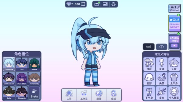 1、主页【角色槽位】可以使用官方预设或自己创作新的人设,右侧【自定义角色】能够调整角色的身体、头发、脸部、服饰等