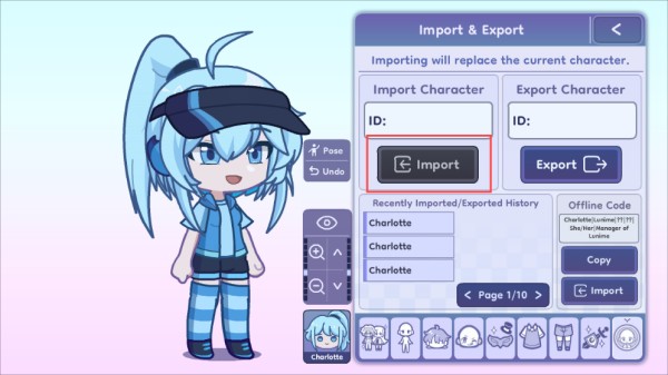 4、点击【Import】上方的ID输入框,将你要代入的代码输入进去后,点击Save->Import即可导入代码