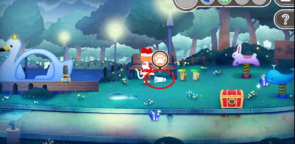 3、然后我们依旧在天鹅船这,先捡起水坑中的荷叶,以及找到旁边柱子里藏着的青蛙