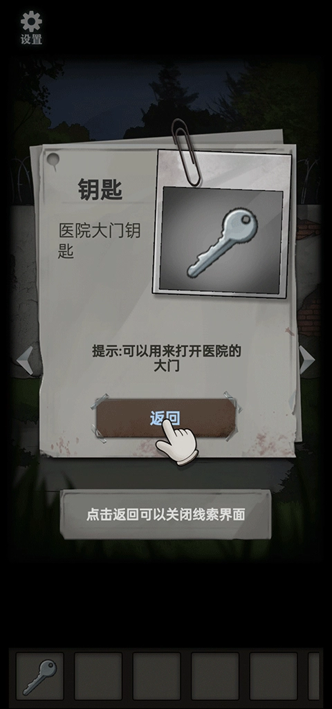 4、在不同场景间进行切换,寻找到钥匙后,将其拾取并放入背包里。