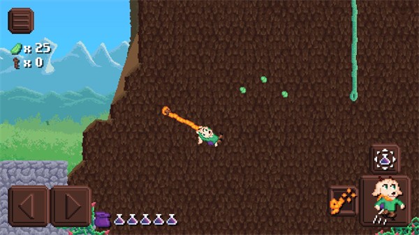 3、在游戏中,左边用于控制角色前进,右边设有跳跃、使用绳索以及投出药瓶的按钮。