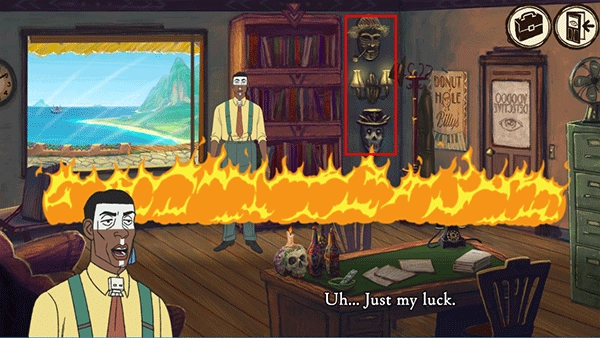 5、于游戏里,若发现“Voodoo Detective”着火的情景,务必保持冷静。接着,仔细查看墙上的两幅面具,保证全部都查看到位。