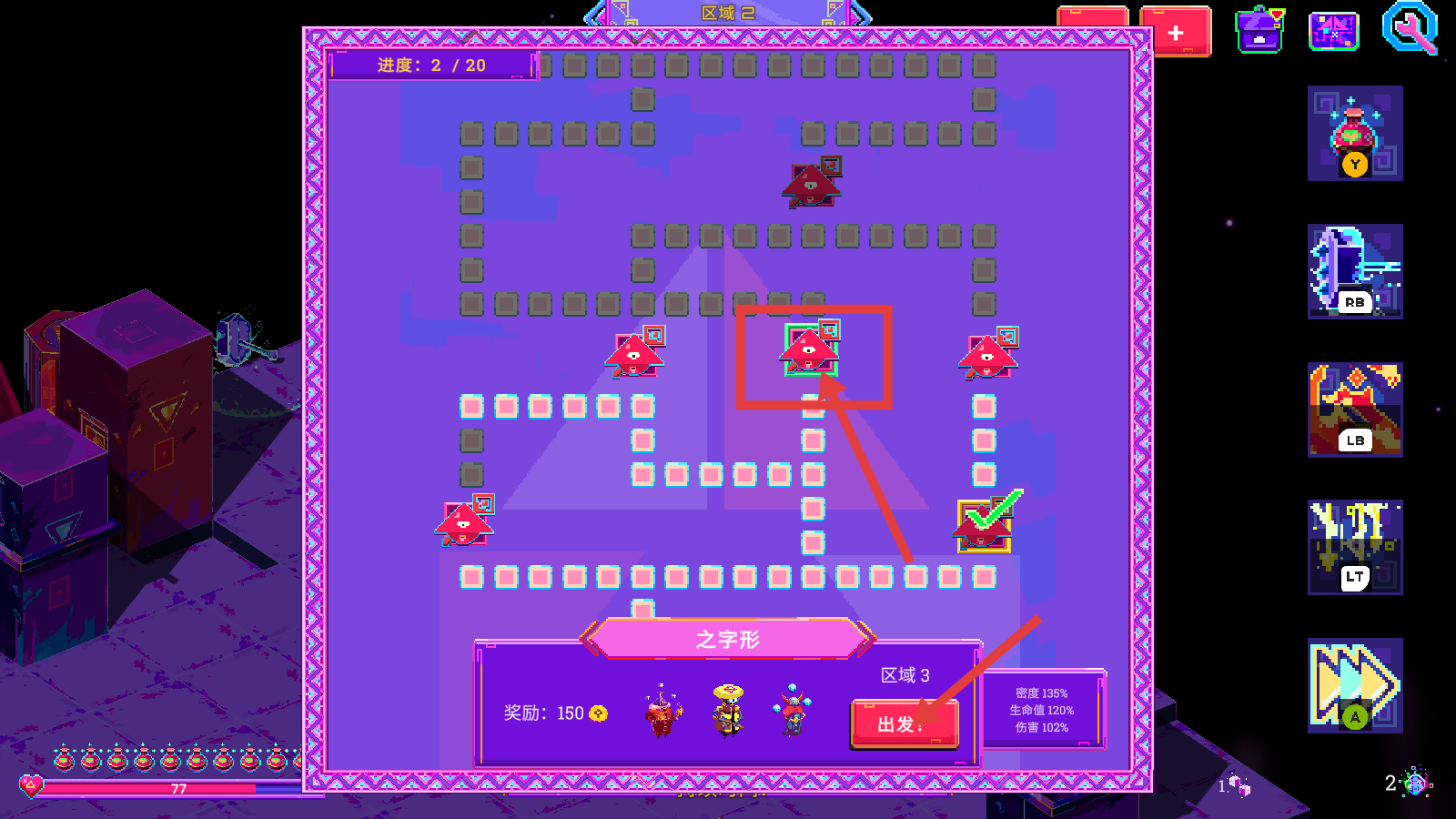 1. 留意【进度 - 2/20】,点击【之字形 - 区域3】中的【出发:】,开启区域探索,迎战红色三角敌人。