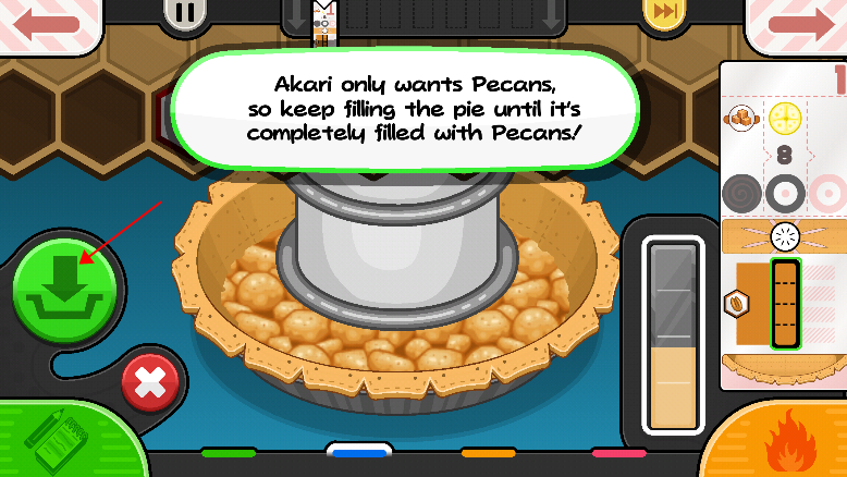 8、通过左右拖动上方的格子来选择水果,把所需水果对准木盆的中间位置。