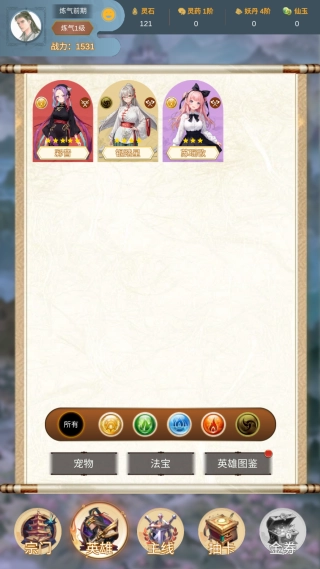 4、查看已拥有英雄的战力和属性,依据“所有”“五行”分类对英雄进行筛选,着重培养高战力英雄,与此同时搭配宠物、法宝来提升整体战力。
