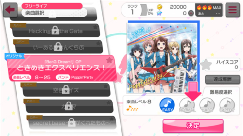 随即来到LIVE 部分,新手教学时只能打本家曲「ときめきエクスペリエンス」的其中一节,但是难度可以自选,Easy最简单,Expert最难。顺带一提,GBP 的LIVE 是非体力制的,只要想打就能随时开打,唯一会消耗的就只有画面右上方的火焰(LIVE BOOST,每三十分钟回覆一个,每一次LIVE 皆会自动消耗一个,发动后在LIVE 中获得的金币、经验值、报酬为平常五倍)。