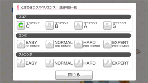 接下来就是成就画面,成就分为「分数」、「指定Combo 以上」和「Full Combo」三种,当中后两种会对应不同难度。完成后会获得不同奖励,包括金币、给角色升级用的训练劵还有石头。