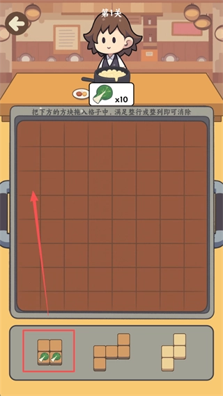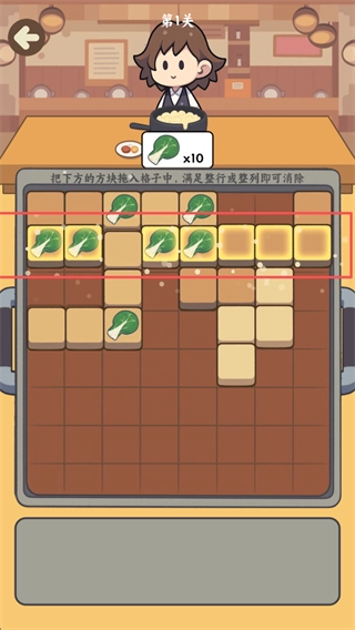 2、核心玩法大揭秘:只需拖动不同形状的积木方块并将其放置好,当整行或整列被填满时,就会自动消除,进而生成顾客需要的食材。