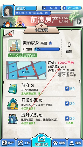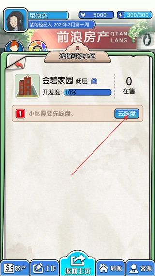 1. 进入游戏后,你将扮演一名房产经纪人。首先,你需要前往小区拜访,点击“去踩盘”按钮以开启任务。