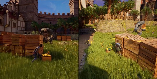25、两人相互配合,扔水果吸引巨魔注意力,当巨魔看向其他方向时快速通过。
