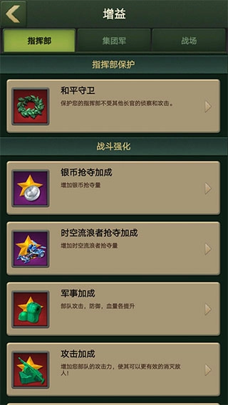 在“指挥部增益”里,能够借助增益道具对指挥部的属性与状态加以改变。