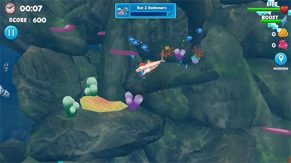 3、游戏拥有极为庞大的地图,您能够操控各类鲨鱼,穿梭于奇妙的景致之间,尽情享用更多的小鱼。