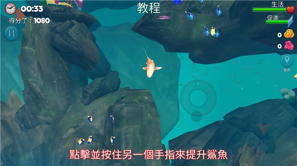 持续使用加速会致使鲨鱼饥饿度上升,赶路时请勿加速,即便靠吃小鱼来加速也是不划算的,只有在捕食人类或者大型猎物时,才选择加速出击。