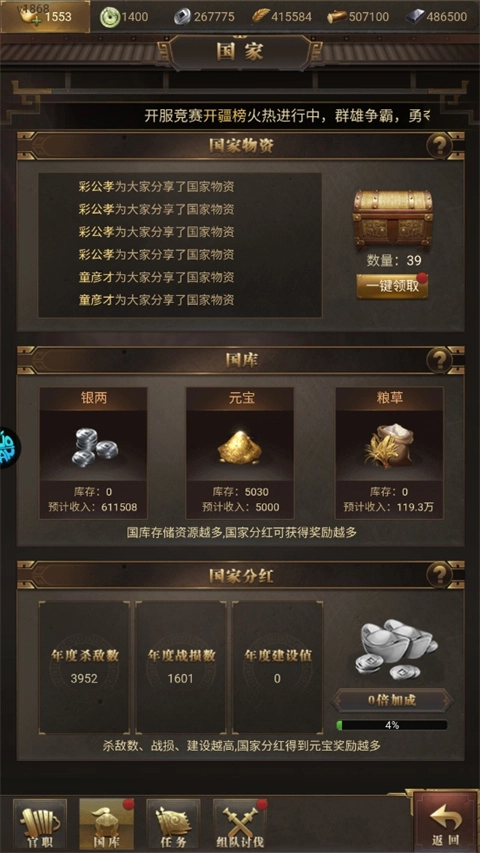 国家分红可领取的奖励倍数,受年度杀敌数、战损数以及建设值的影响。