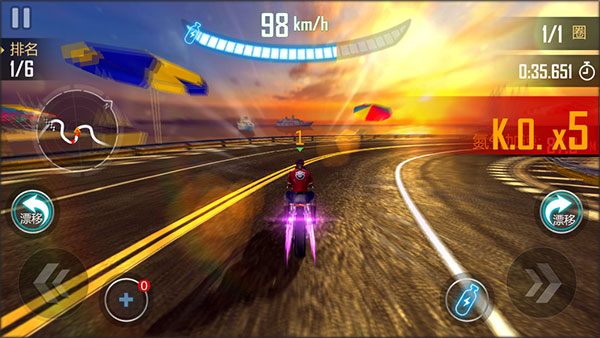 玩家角色头顶的数字,代表着当下所处的名次。游戏里具备左漂移与右漂移操作,左下角设有用于干扰对手的火箭弹,右下角则是加速瓶。而且在游戏过程中捡到的道具,在本局游戏内均可使用。是不是已经让大家迫不及待、跃跃欲试啦~